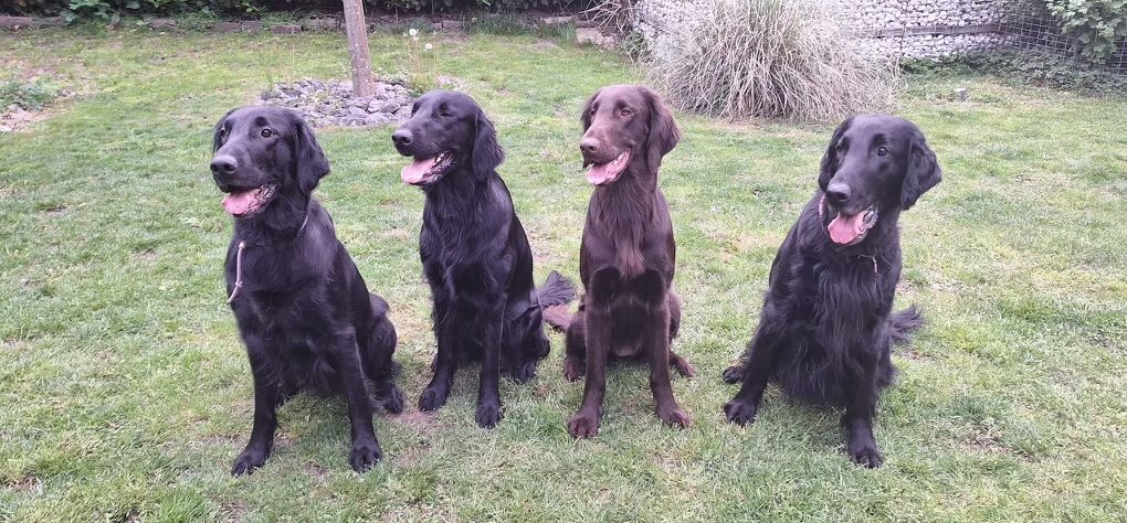 Calla (Enyas Mama), Mayce (Enyas Schwester & Gingers Mama) sowie Faible (Ginger Schwester) stürmten in unseren Garten, sprangen über- und durcheinander und es gab ein wuseliges Knäuel aus energiegeladenen Flat-Coated-Retriever-Hündinnen zu bewundern.