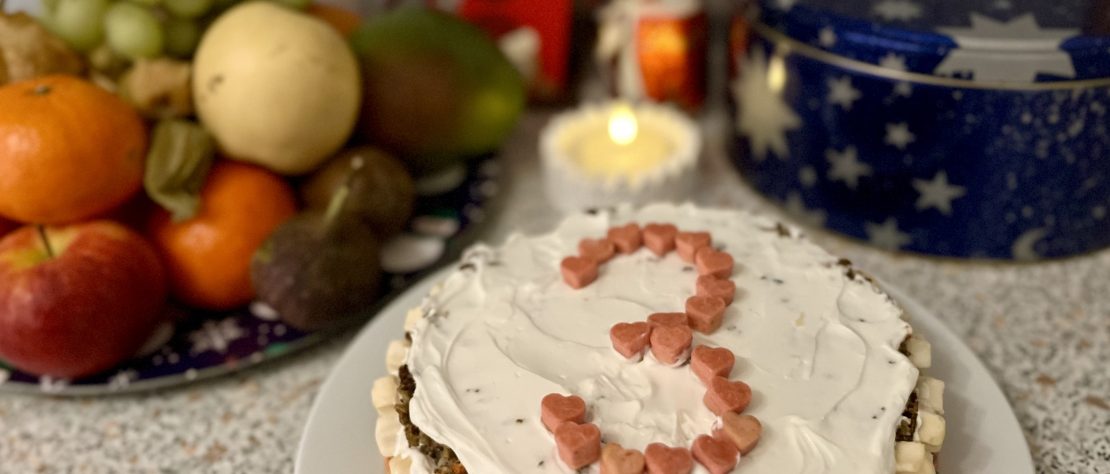 | Natürlich hast Du die obligatorische Geburtstagstorte bekommen. Du konntest es schon gestern kaum erwarten… Aber wer kann es Dir verdenken – der Duft von gebackenem Hirschhack ist einfach unübertrefflich!Aber ich bewundere wie liebevoll Du den Ziegenfrischkäse abschleckst – Deine Tante sichert sich immer sofort einen großen Happs. 😀 |