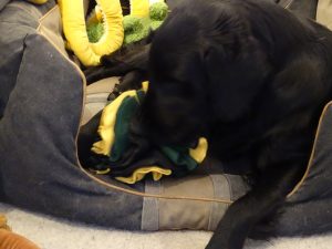 Michaela hat erst im Kreativzimmer und dann in Küche mit spannend riechenden Decken hantiert. Da mir das Zuschauen zu langweilig war, hab ich ein Nickerchen gemacht. Aber dann stand Frauchen plötzlich stolz mit einem unglaublich lecker riechenden Flauschball in jamaikanischen Nationalfarben vor mir. Okay, ehrlich gesagt, ist mir die Farbe total egal, aber der roch soooooo yummy! Gut, dass ich ihn direkt ausprobieren durfte. 🙂