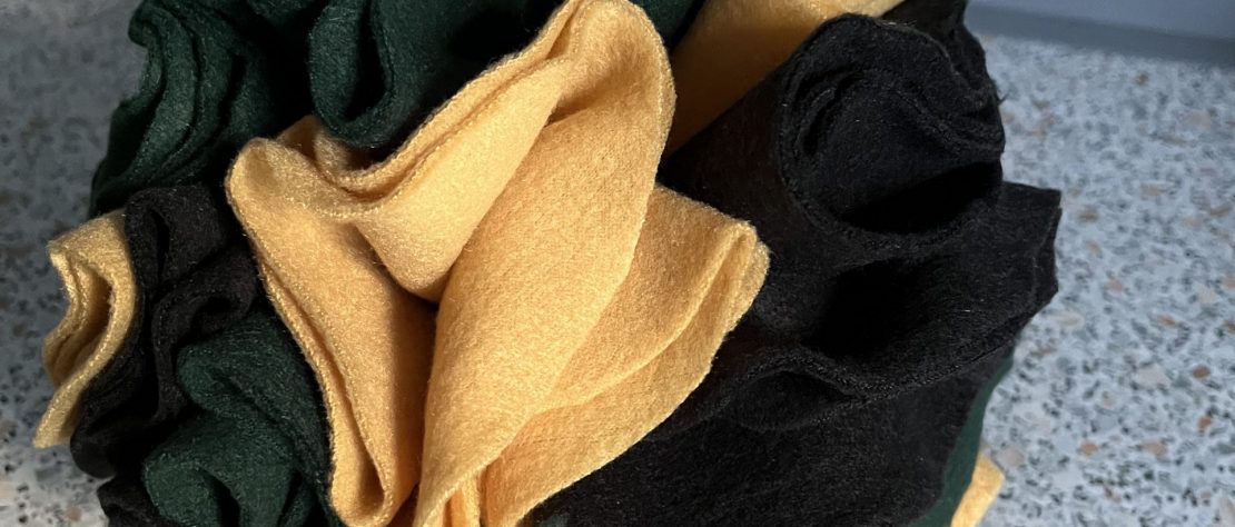 Dann faltet man die Kreise zweimal und sticht durch die Ecke ein Loch. Wichtig: Man sollte darauf achten, beim Durchstechen alle 4 Stofflagen zu erwischen. Dann fädelt man 4 x 8 Stoffpäcken auf die Kabelbinder und zieht einen davon locker zu.
