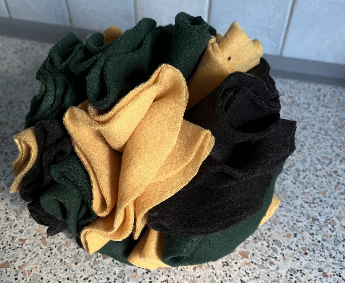 Zum Schluss zieht man alle 4 Kabelbinder fest, schneidet den Überstand hat, zupft den Schnüffelball etwas in Form und hat so in wirklich kurzer Zeit (45 Minuten) eine tolle Beschäftigung für seinen Hund geschaffen.