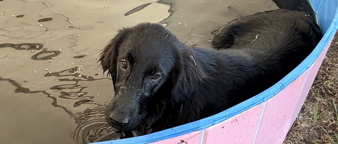 Aber natürlich mussten wir erstmal wieder Stillsitzen üben – immer noch nicht meine Kernkompetenz. Nachdem ich auch beim Apportieren von der Wiese eher mein eigenes Ding gemacht hab, merkte ich schon, dass Frauchen etwas grummelig wurde. Also hab ich mich beim Wasserapport besonders angestrengt und versucht, ein Entchen aus dem Pool zu fischen.