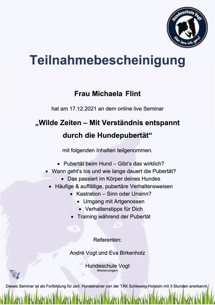 Michaelas Fortbildungen in Sachen Hundeerziehung und -pflege