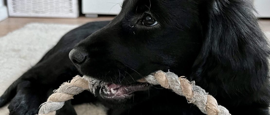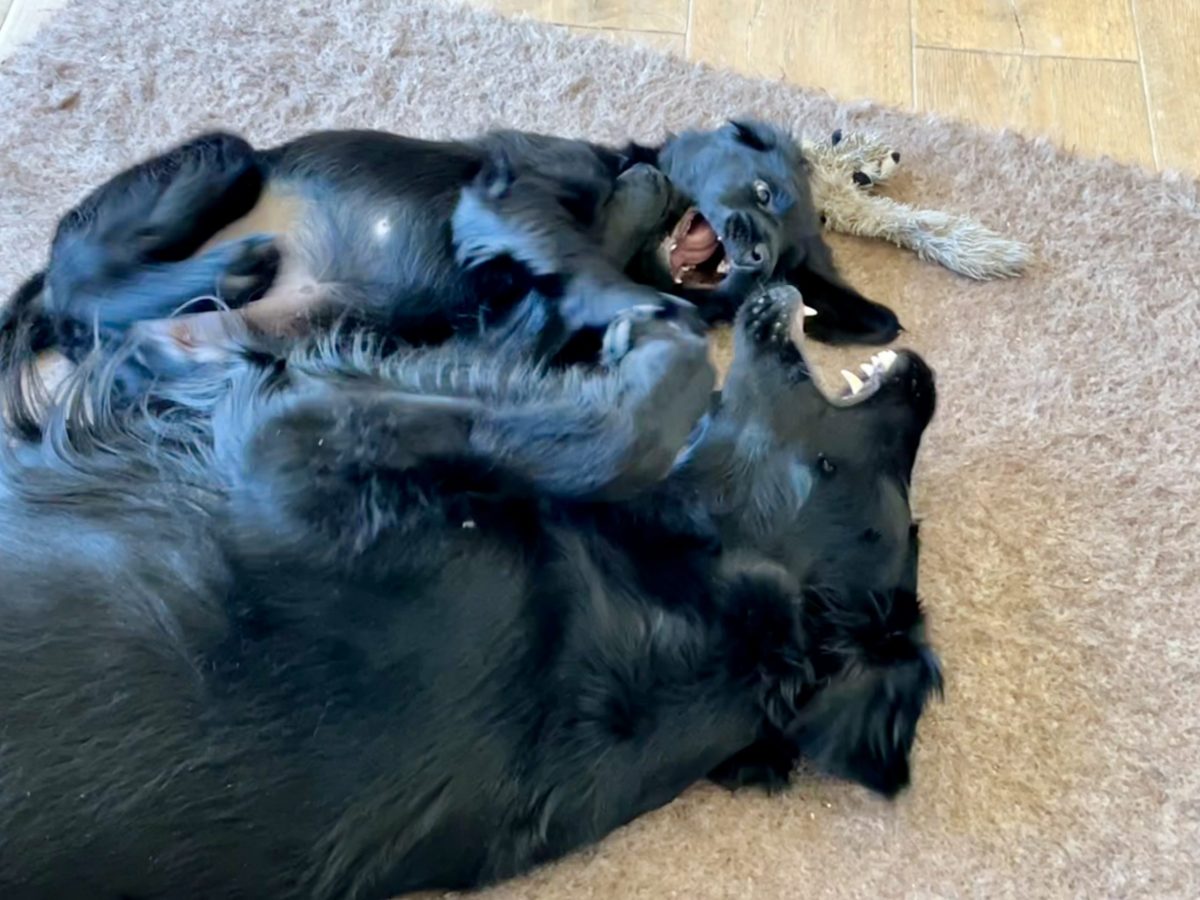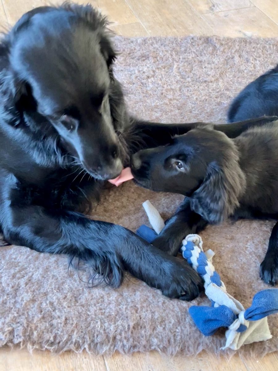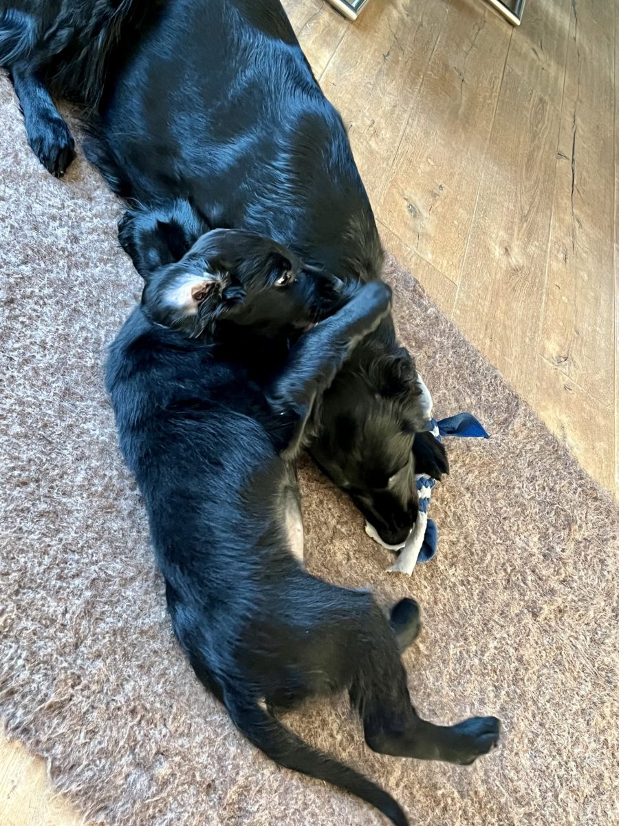 Gut, dass man die Energie der beiden in Zerrspiele umlenken kann. Auch hier können wir nicht sagen, dass Enya per se die Siegerin ist. Ginger verhakt sich einfach mit einem ihrer Vampirzähnchen im Fleece und lässt nicht mehr los. Auch nicht, wenn die Große sie durchs Wohnzimmer zieht oder schüttelt. Die Löcher im Zergel sind stille Zeitzeugen eines sich vollziehenden Machtwechsels im Hause Alvarez-Flint… Dieser äußert sich auch in bereitwilligem Überlassen des Körbchens seitens Enya oder auch – was wir wirklich erstaunlich finden – des Zurückweichens, wenn Ginger sich an Enyas Kauartikel vergreifen will. Beides versuchen wir zu verhindern, denn ein 9-wöchiger Welpe muss einer knapp dreijährigen Hündin nun wirklich noch nicht zeigen, wo der Hammer hängt. Dafür ist noch mehr als genug Zeit.
