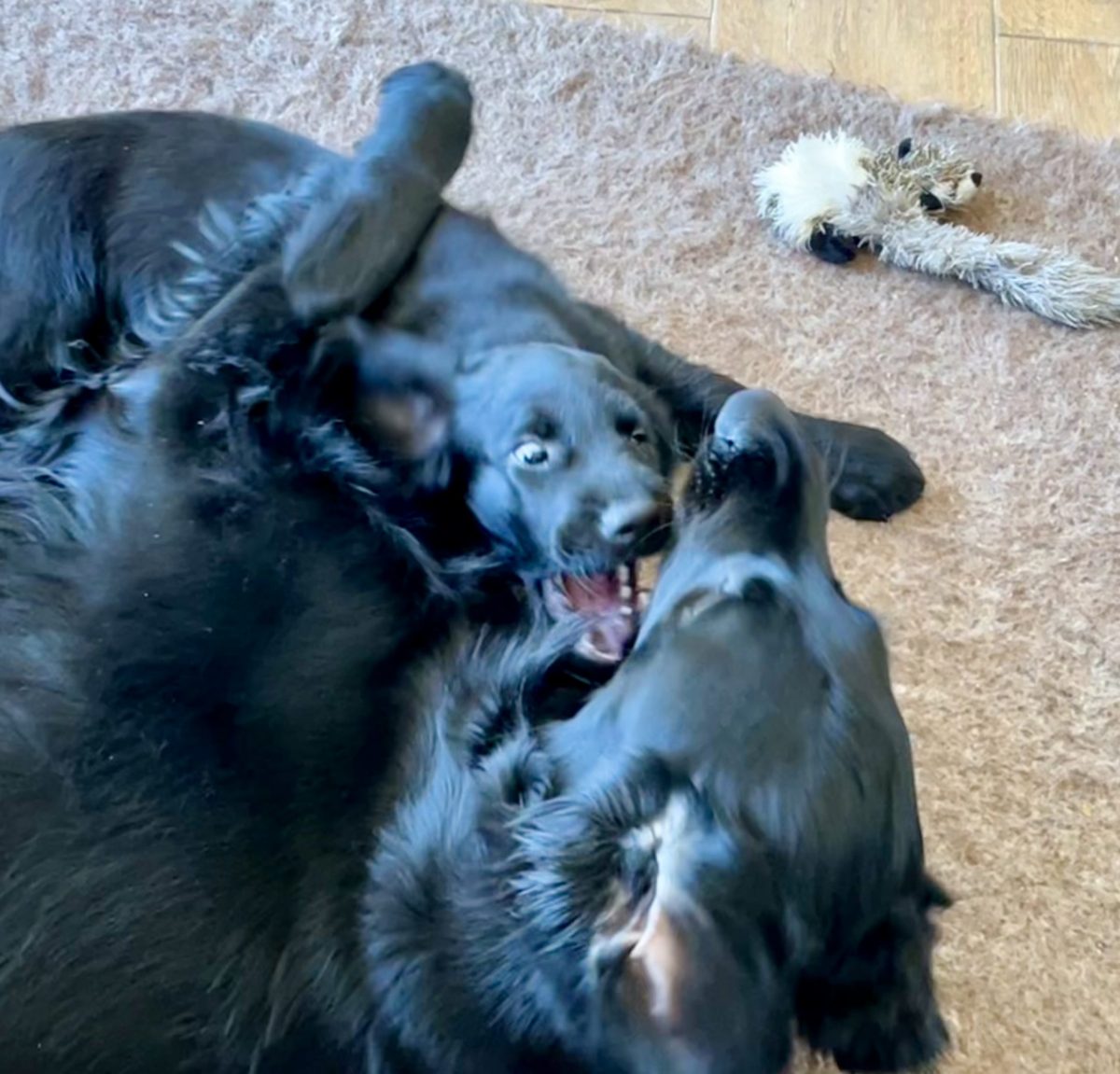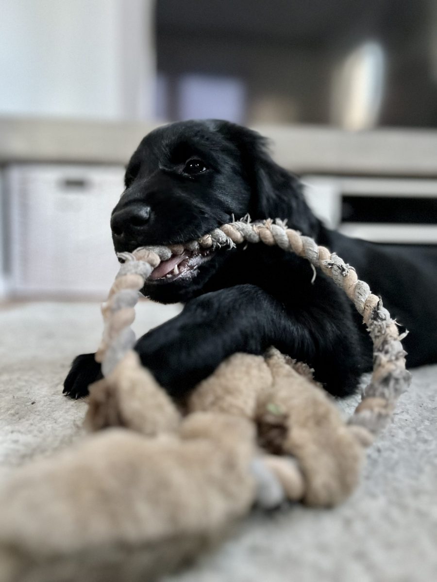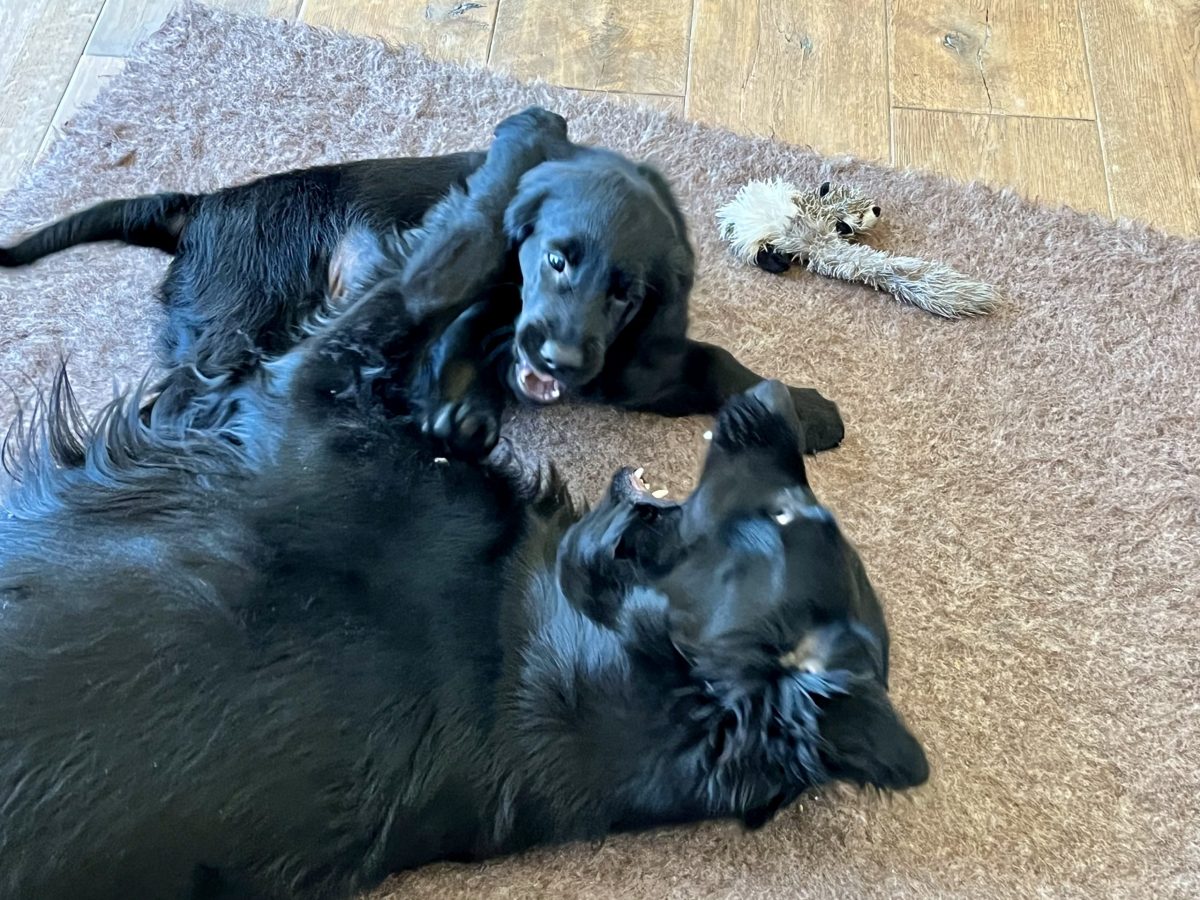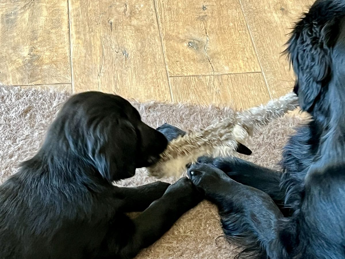 Gut, dass man die Energie der beiden in Zerrspiele umlenken kann. Auch hier können wir nicht sagen, dass Enya per se die Siegerin ist. Ginger verhakt sich einfach mit einem ihrer Vampirzähnchen im Fleece und lässt nicht mehr los. Auch nicht, wenn die Große sie durchs Wohnzimmer zieht oder schüttelt. Die Löcher im Zergel sind stille Zeitzeugen eines sich vollziehenden Machtwechsels im Hause Alvarez-Flint… Dieser äußert sich auch in bereitwilligem Überlassen des Körbchens seitens Enya oder auch – was wir wirklich erstaunlich finden – des Zurückweichens, wenn Ginger sich an Enyas Kauartikel vergreifen will. Beides versuchen wir zu verhindern, denn ein 9-wöchiger Welpe muss einer knapp dreijährigen Hündin nun wirklich noch nicht zeigen, wo der Hammer hängt. Dafür ist noch mehr als genug Zeit.