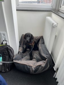Mit Michaela war ich auch wieder in ihrem Büro in Hamburg. Bus- und Zugfahren macht mir echt nichts mehr aus, vor allem wenn man auf so viele nette Menschen trifft, die – ihr ahnt es – alle mit mir kuscheln wollen. Aber ich habe sogar ein eigenes Bett in Frauchens Büro und wir können dann hoffentlich bald auch auf den Buggy verzichten. Der ist zwar ganz cool, weil ich alle im Blick habe und gleichzeitig darin auch sehr bequem schlafen kann, aber rumlaufen fänd ich noch viiiiiel spannender.