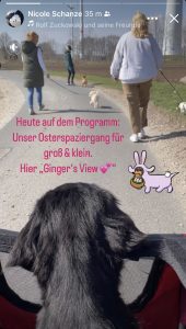 Auf dem Osterspaziergang war ich jedenfalls der heimliche Star und die ganzen mehr oder weniger erwachsenen Hunde waren abgemeldet. Ich tauchte sogar in der Insta-Story der Hundeschule auf! Früh übt sich halt, wer ein Social Media Star werden will. 😉