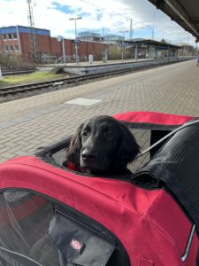 Mit Michaela war ich auch wieder in ihrem Büro in Hamburg. Bus- und Zugfahren macht mir echt nichts mehr aus, vor allem wenn man auf so viele nette Menschen trifft, die – ihr ahnt es – alle mit mir kuscheln wollen. Aber ich habe sogar ein eigenes Bett in Frauchens Büro und wir können dann hoffentlich bald auch auf den Buggy verzichten. Der ist zwar ganz cool, weil ich alle im Blick habe und gleichzeitig darin auch sehr bequem schlafen kann, aber rumlaufen fänd ich noch viiiiiel spannender.